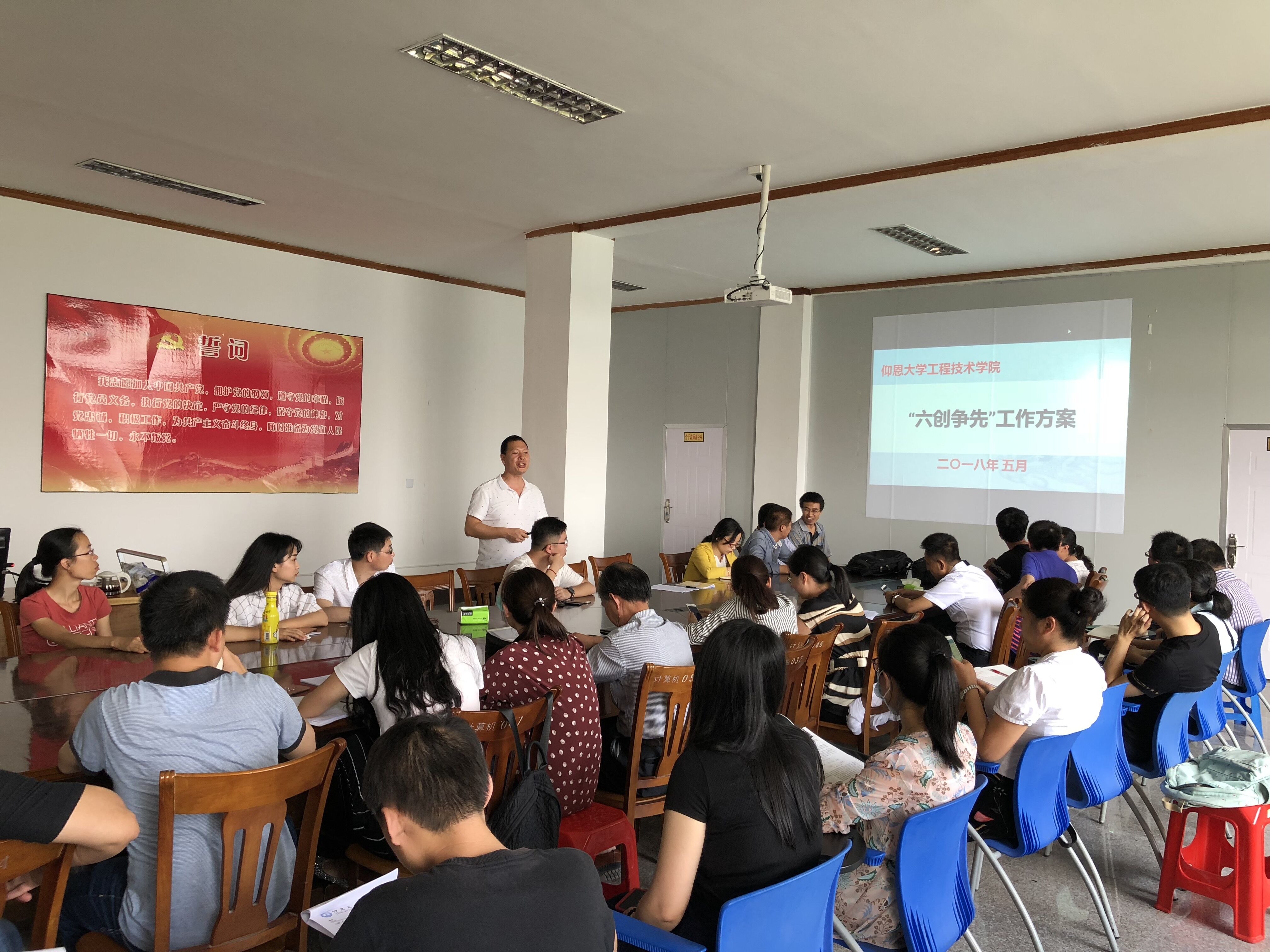 其次,学院领导根据学院实际制定学院“六创争先”方案,针对教学创质,学科创特,科研创新,人才创优,管理创效,党建创强六个方面在会议上进行深入部署。