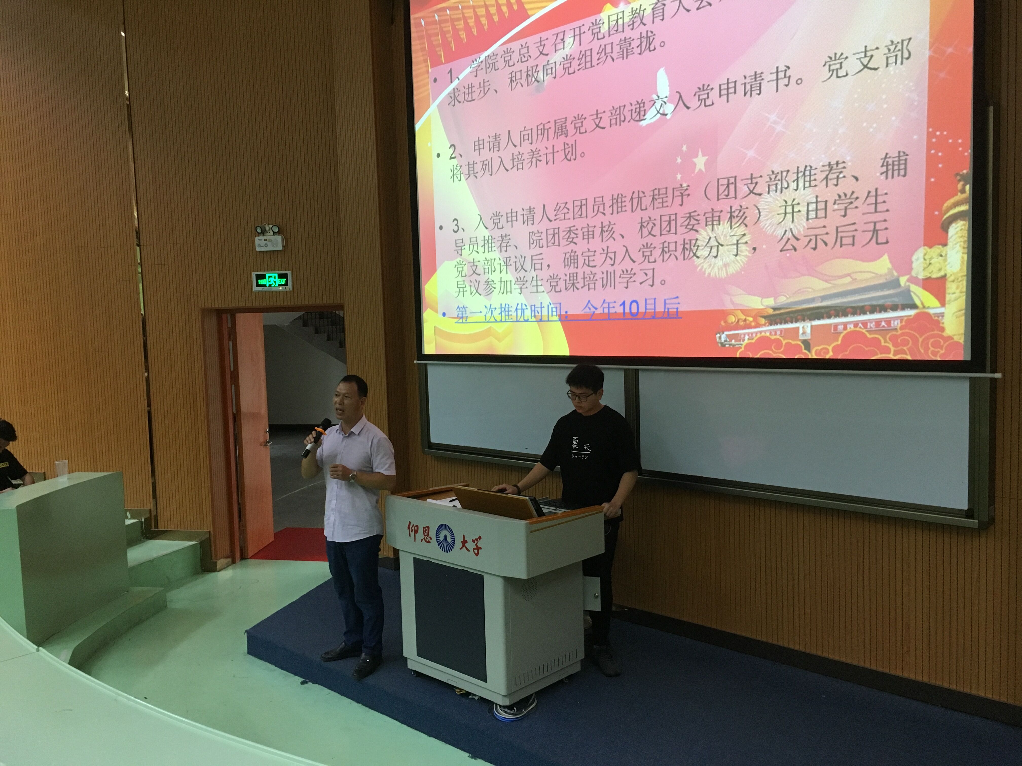 大会首先在曾凤生书记的精彩演讲中拉开序幕,曾书记着重强调党员的先进性和纯洁性,大力鼓励大一新生积极向党组织靠拢,入党不仅仅是一种荣誉,更是一种对自我意识的提升和挑战。接下来,由我们的党总支副书记吕思仁老师为大一新生讲解入党推优等相关程序及注意事项;吕老师为同学们详细介绍撰写入党申请书的格式要求,包括标题,称谓,正文及结尾的格式等等;吕老师特别强调申请书的思想内容,他希望同学们积极向党组织靠拢,不仅要在行动上入党,更要在思想上入党,最后,院团委组织部部长曾智辉同学为同学们介绍了推优的流程和标准。同学们也在会上认真听讲并做好相关笔记。除此之外,本次大会还加入了学生会、电子数模协会、电脑协会的纳新推介会,旨在给新生创造一个全面发展的活动平台。
