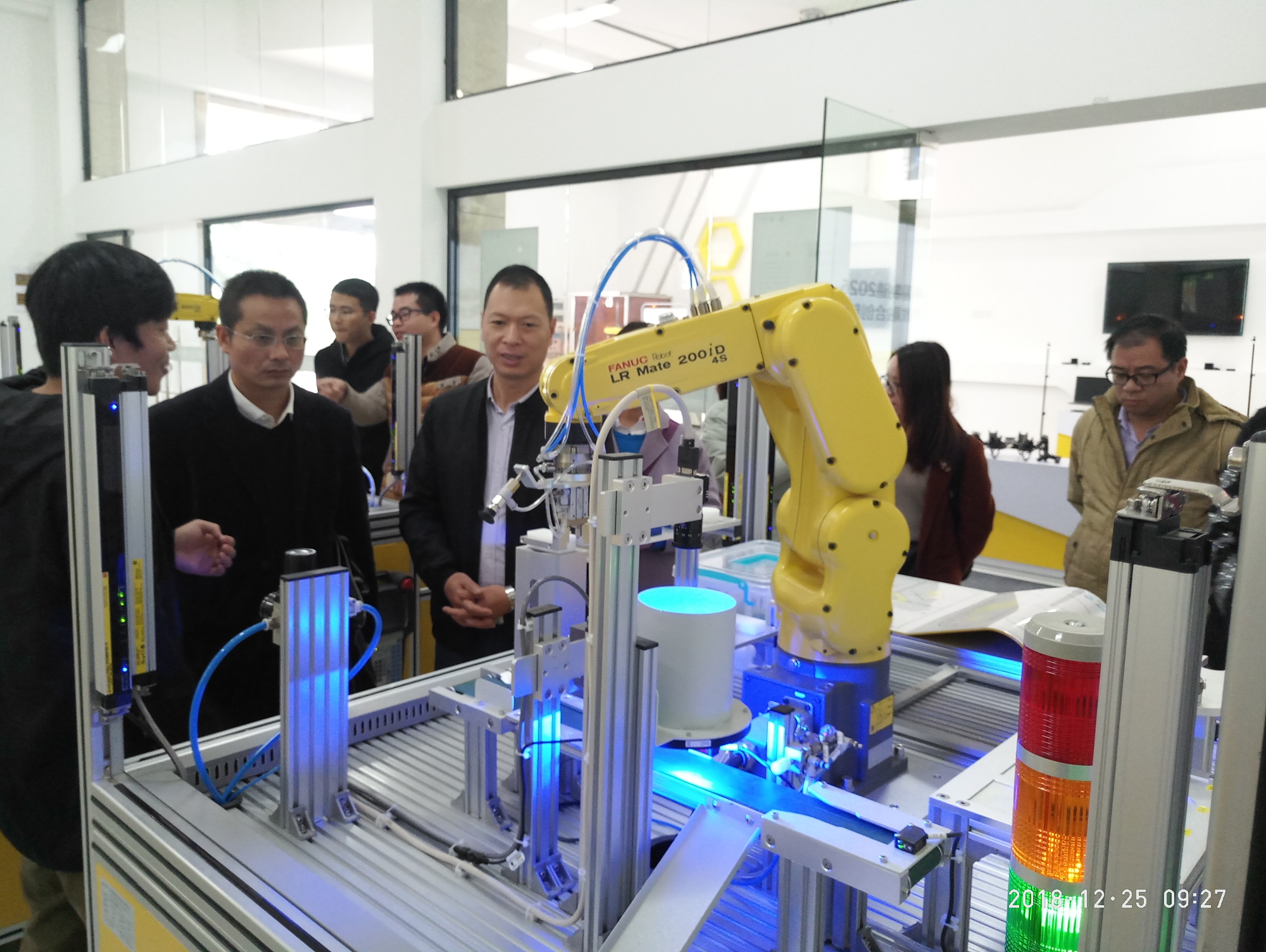 华厦学院信息与智能机电学院周院长对智能制造实验室进行了详细介绍,智能制造创新工坊是华厦学院新投建的智能制造实践基地,目前已经建设完成智能制造工业链的设计安装,正在对设备进行测试。实验室全部建成后,不但可以满足教学、科研的需要,还可以对接在地中小企业,为企业提供工业设计制造等服务。