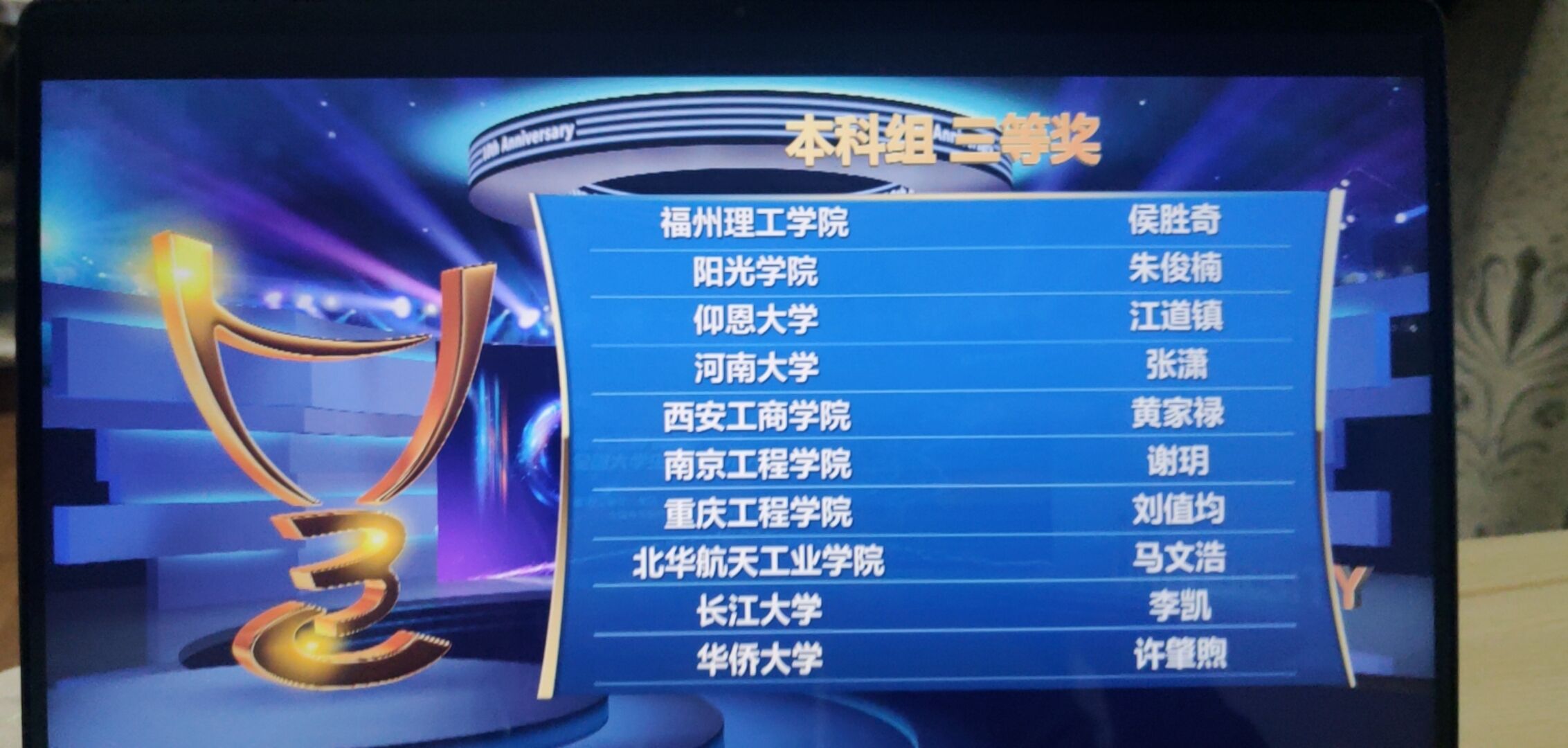2020年12月5日,“新华三杯”全国大学生数字技术大赛决赛在泉州信息工程学院举办。经过预赛选拔,诸侯快讯共有3名同学(江道镇、陈鑫、严钟灵)进入决赛,江道镇同学在本次比赛中荣获三等奖,陈鑫、严钟灵同学荣获优胜奖。