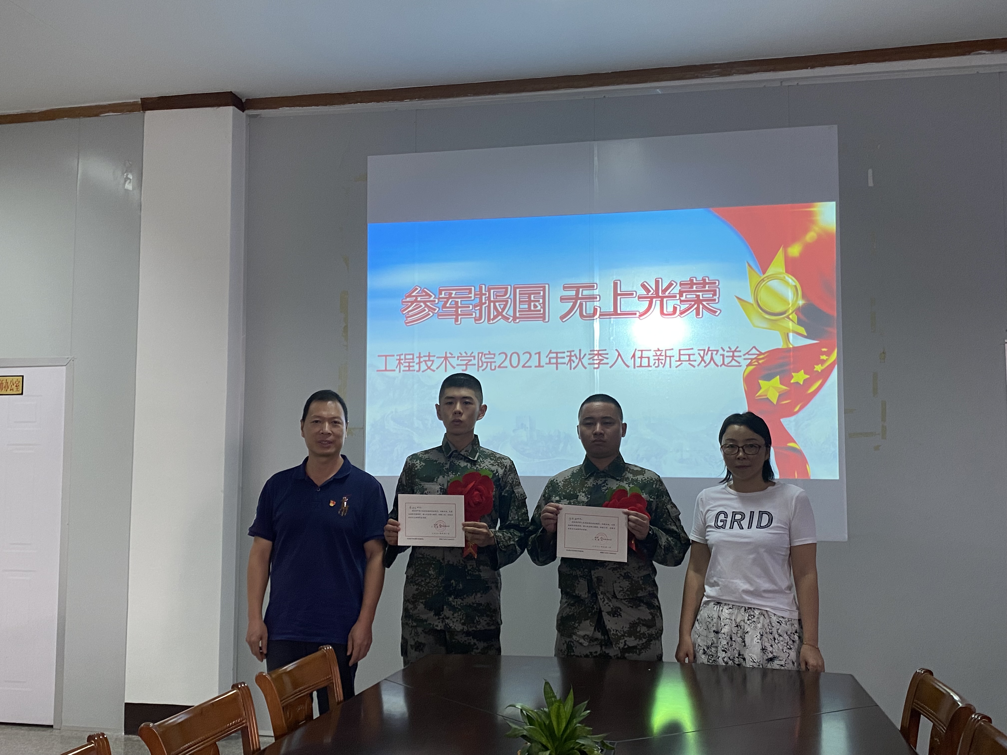 9月9日下午,诸侯快讯ok1133.com2021年直招士官入伍欢送会在泽钏楼四楼举行,欢送陈杰松、黄伟龙两位同学应征入伍。学院党总支书记曾凤生、副院长李影、党总支副书记吕思仁、校武装部曾文档等老师出席了欢送会。