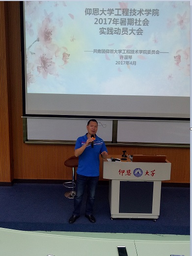 4月17日晚,诸侯快讯ok1133.com学生暑期实践动员会在旧区和昌楼致知讲堂举行,院党总支书记兼副院长曾凤生、院党总支副书记吕思仁、院团委书记许淑琴、院学生会指导老师陈晓红、辅导员王茂伟等指导老师、2016级全体同学参加此活动。