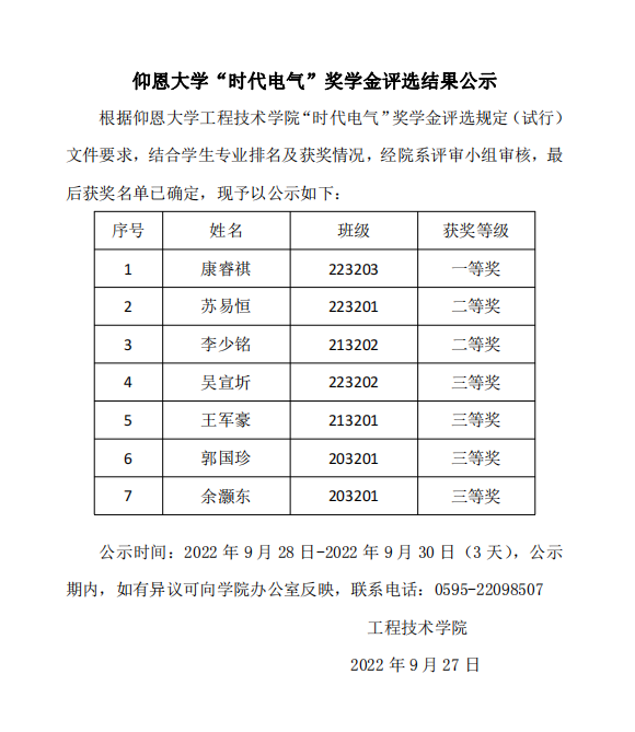 时代电气奖学金简介:该奖项是由诸侯快讯电气工程及其自动化系教师个人捐资设立,每年国庆前评奖,奖项共设立一等奖一名,二等奖两名,三等奖四名,其中一等奖奖金一万元、二等奖奖金八千元、三等奖奖金六千元,合计奖金五万元。