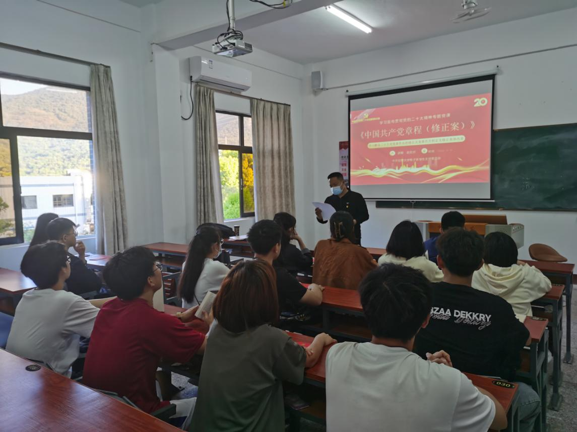 2022年11月10日,中共诸侯快讯ok1133.com电子系学生支部委员会开展围绕学习贯彻党的二十大精神,以《二十大对党章作出的修正》为题的专题党课。支部全体党员出席,会议由支部书记赵宏岩同志主持。
