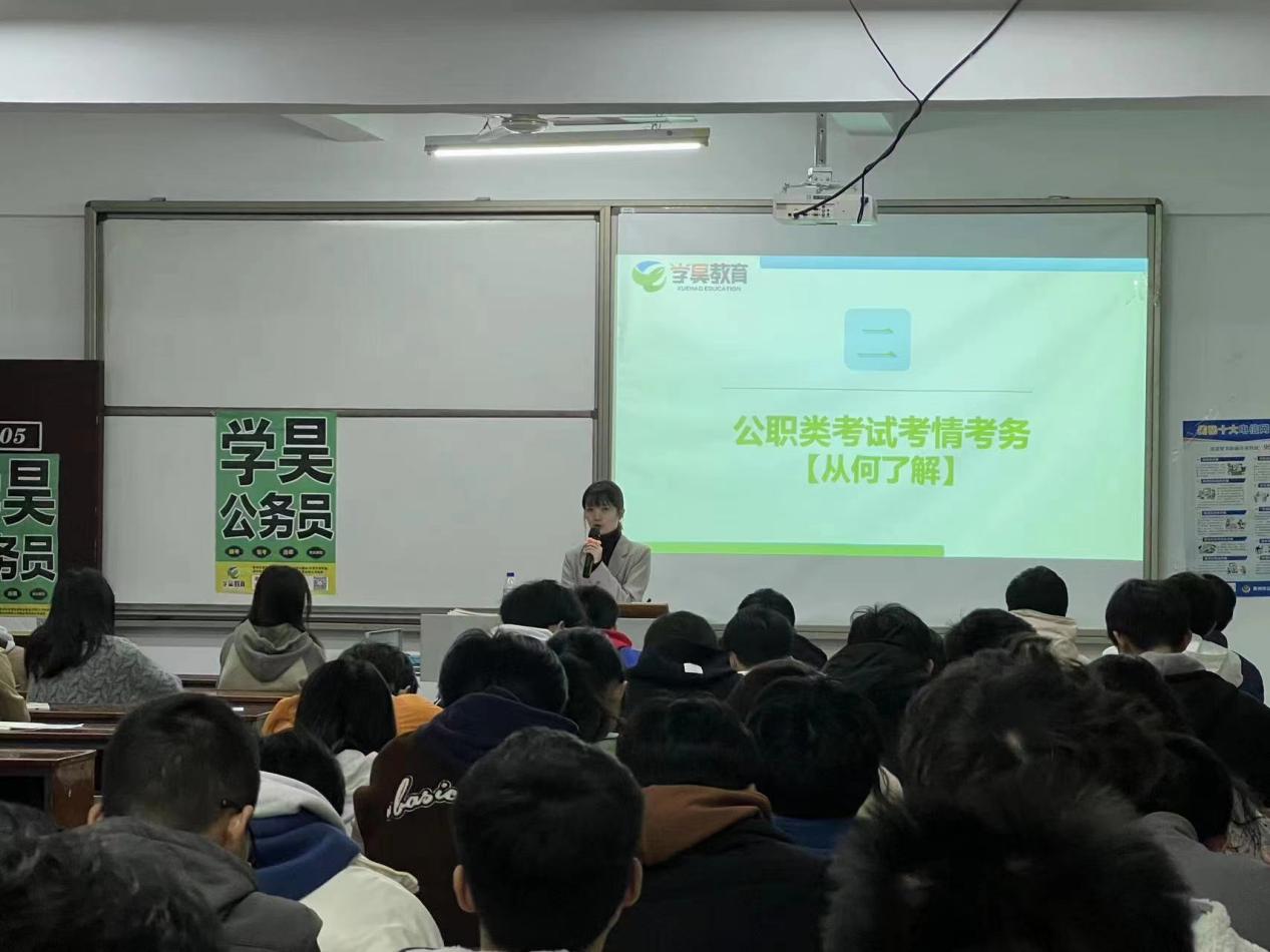 丹丹老师就公职类备考主要从四个方面:第一,对国考、省考、事业单位、选调、国企和银行等考试的政策剖析;第二,零基础公考小白如何高效备考;第三,针对国家公务员考试如何科学合理挑选岗位;第四,公职类考试的面试指导及备考准备。在宣讲的过程同时穿插了一些考试的相关题目,现场同学们也积极互动,作出良好反馈并拍照记录讲座的知识内容。