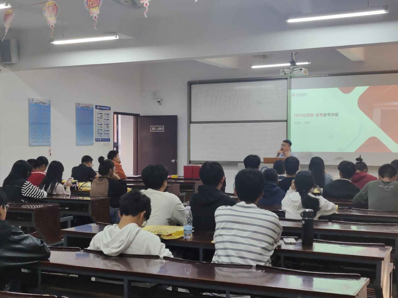 讲座中,吴生向大家详细介绍了公务员薪酬与发展机遇、各类公务员考试的区别以及各地区每年招考公务员的数量等具体信息,结合同学们的需求,针对性开展了政策解读及考情分析,并指出公务员考试的趋势变化及竞争情况。吴生指出,大学生应根据个人条件选择适合自己的公务员岗位,鼓励学生制定科学的备考计划,合理安排学习内容,并针对个人薄弱处加强练习。最后,吴生分享了自己从事公务员报考就业指导的经验,耐心解答了同学们的问题,以便同学们更好地规划备考公务员的复习安排。