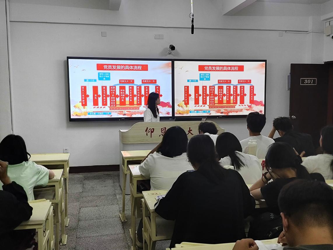 会上,先由党务助理徐美娟、张菲同学讲解了共青团员的发展条件和流程,二人从申请条件、志愿书填写规范到团组织考察标准,逐一明确关键节点;接着由支部成员欧阳翔、宋婉淇同志介绍入党流程,二人梳理了从递交入党申请书、成为积极分子、确定发展对象、成为预备党员和预备党员转正的完整流程要求。她们结合新生认知特点,用校园生活案例替代生硬理论,帮助新生理清入团及入党的步骤及要求。